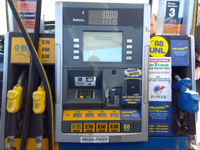 米国ガソリンスタンドの計量ポンプ(E30から85はバイオエタノールの混合率 88はE15を示す)
