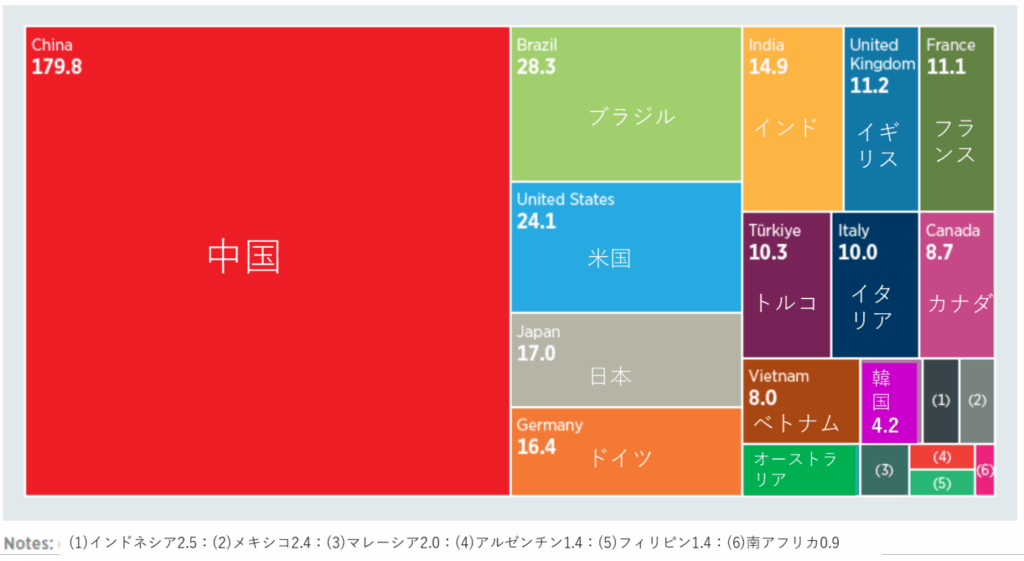 この図で衝撃的なのは全体の約半分という巨大な面積を中国一国が占めていることだ。つづいてブラジル、米国、日本、ドイツと続くが、中国以外のすべての面積を足し合わせて、ようやく中国とほぼ同等の面積となる。