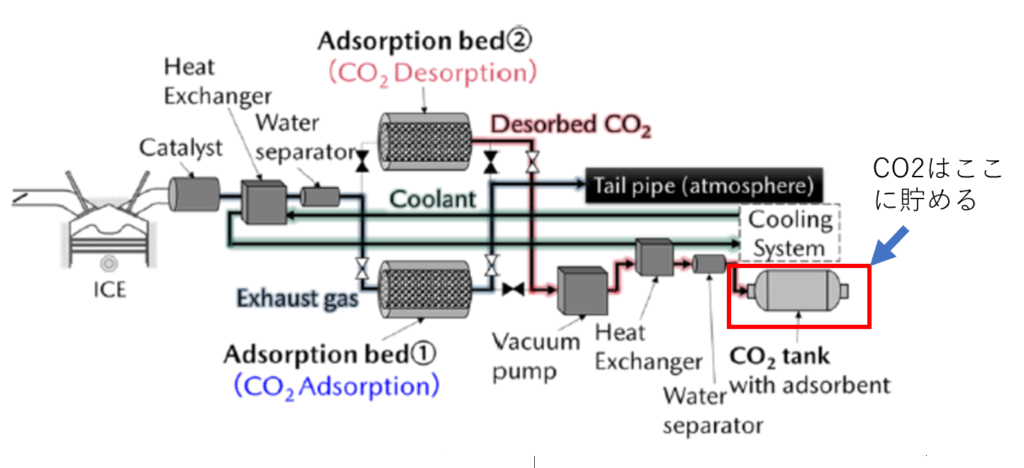 この装置の場合、ガソリン車の排ガスはゼオライトを主体とした吸収材を通すことによってCO2が吸収され、CO2を含まない排ガスが排出される。CO2を吸収したゼオライトは真空ポンプで吸引されることによって、CO2が分離される。この吸収と分離を繰り返すことによって、排ガス中のCO2が連続的に分離されていくことになる。では分離されたCO2はどうなるかというと、CO2タンクの中に貯蔵されていくことになる。