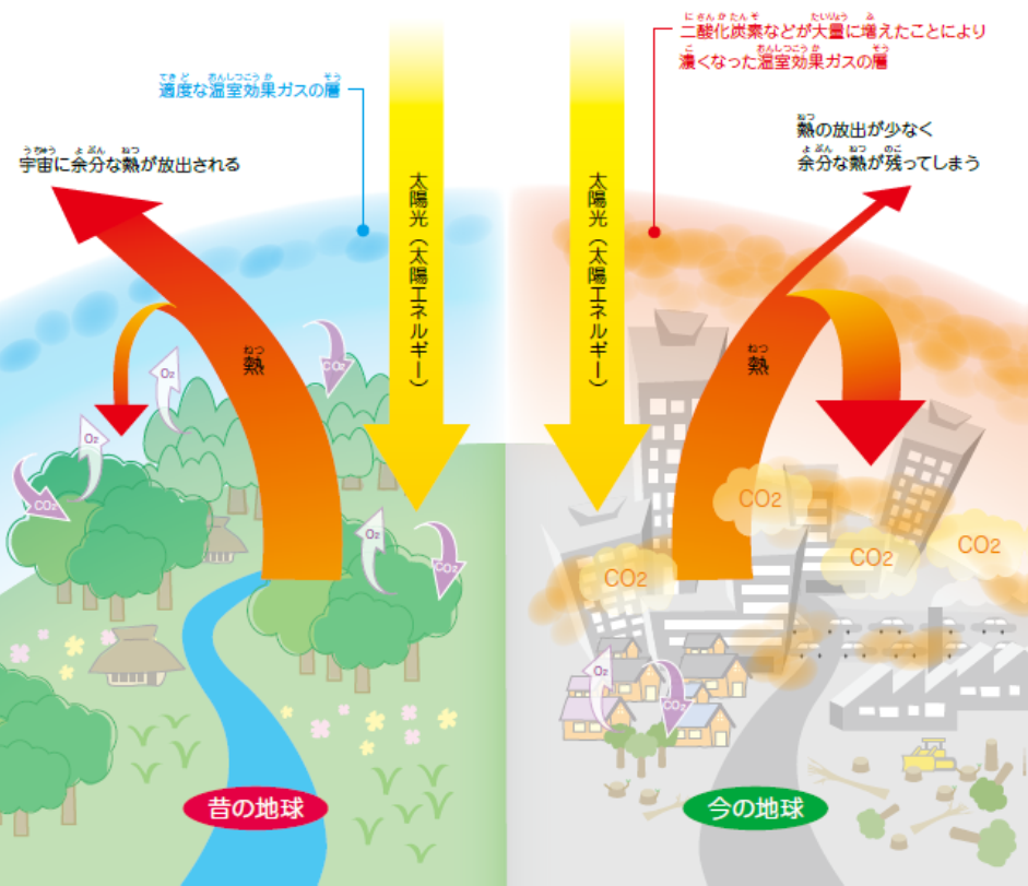 この図を見ると、地球上空に温室効果ガスの層があり、それに地球から放出される熱(赤外線)がぶつかって反射される。かつては温室効果ガス濃度があまり高くなかったので、反射される熱もそれほど大きくなかったが、現在の地球は温室効果ガスの層の濃度が高くなっているので反射される熱が増えて地球が温暖化される。