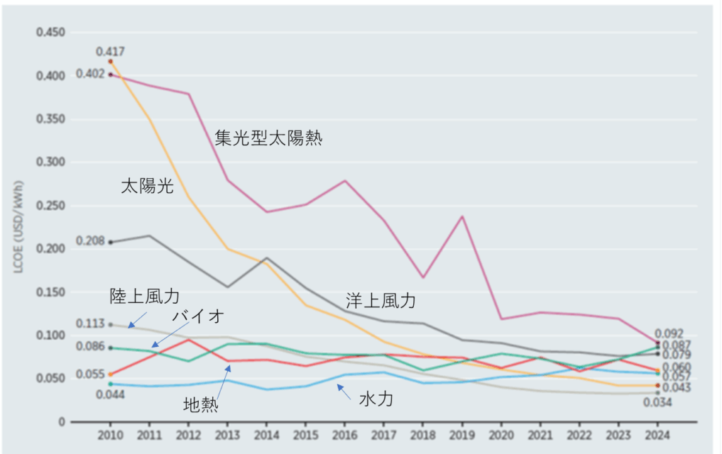 このグラフをみれば、再生可能エネルギーによる発電コストは2010年に比べて大幅に低減しているものが多いことが分かる。太陽光で約10分の1、集中型太陽熱で約4分の1、陸上風力で約3分の1、洋上風力で約半分以下まで低下している。(ただし、バイオマスや地熱はあまり改善が見られなかった。)