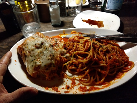 付け合わせにスパゲッティが添えられているとメニューには書かれていたが、付け合わせのレベルを超えているだろう。なんとかこの写真のように食べたが、あとはギブアップ。