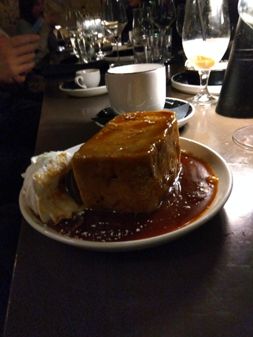 これはいったい何だ?と思われるかもしれないが、隣の席の通訳の人が頼んだ昼食後のデザートだ。豆腐くらいの大きさのパンにキャラメルソースをたっぷり掛けたもの。左の白いのは生クリーム。一口だけ食べさせてもらったが、ごく甘。