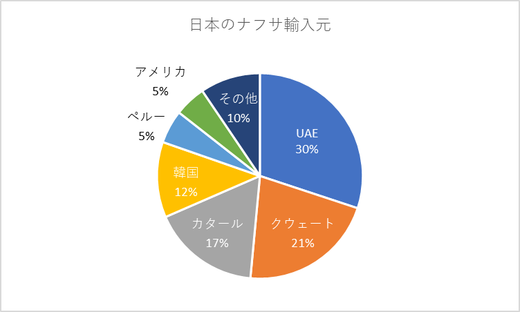 ではどこからナフサを輸入しているかというと、その多くはUAE、クウェート、カタールの中東諸国とお隣の韓国で、この4か国で輸入量の8割を占める。